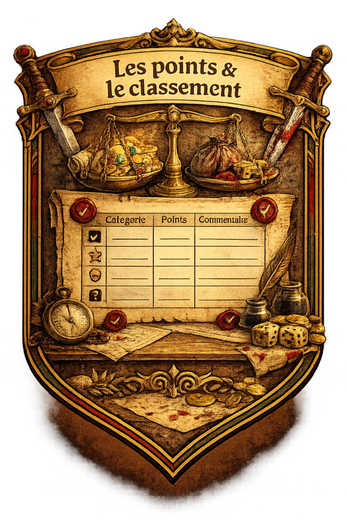 | Passager inscrit | Passager déclaré lors de l’inscription | Points ajoutés après chaque énigme validée, calculés sur l’ensemble des passagers inscrits de l’équipe | +3 | |